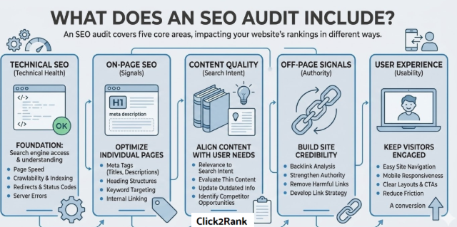 An SEO audit covers five core areas of your website: technical health, on-page SEO, content quality, off-page signals, and user experience. Each one affects your rankings differently: